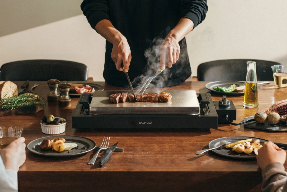 理想の火入れを、ご自宅で。BALMUDA The Plate Proは、常識を覆す6.6㎜厚のプレートと正確な温度制御で、プロの味わいを実現します。焼き上がった料理をプレート上で切り分け、そのままサーブすることも。それは今までのホットプレートでは想像できなかった、本格的な鉄板焼き体験です。