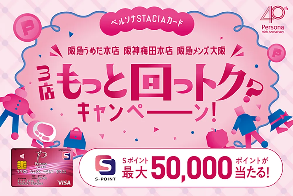 期間中、阪急うめだ本店・阪神梅田本店・阪急メンズ大阪を買い回りして、ペルソナSTACIAカードのクレジット払いで合計30,000円(税込)以上ご利用いただくと、抽選でSポイントをプレゼント!(エントリー不要) 一部対象外の売場やお支払い方法がございます。詳しくは注意事項をご確認ください。 |