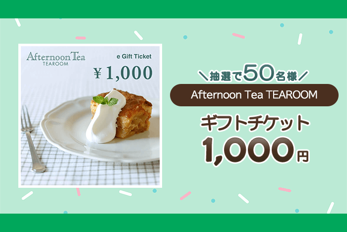 プレゼントアフタヌーンティー・ティールーム、アフタヌーンティー・ベイカリー、アフタヌーンティー・ラブアンドテーブルの店内メニュー・テイクアウト商品の、どちらにもご利用いただけるチケットを抽選で50名様にプレゼント!