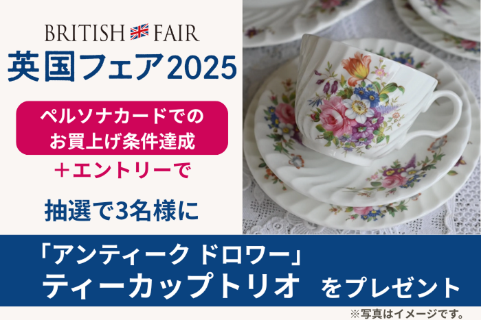 『阪急うめだ本店 英国フェア2025』の期間中、会場内にてペルソナSTACIAカードでクレジット払い税込5,000円以上(期間中合算可)お買上げのうえ、ペルソナWebサービスからエントリーいただいた方の中から抽選で3名様に、「アンティーク ドロワー」“ティーカップトリオ”をプレゼント。●エントリー期間