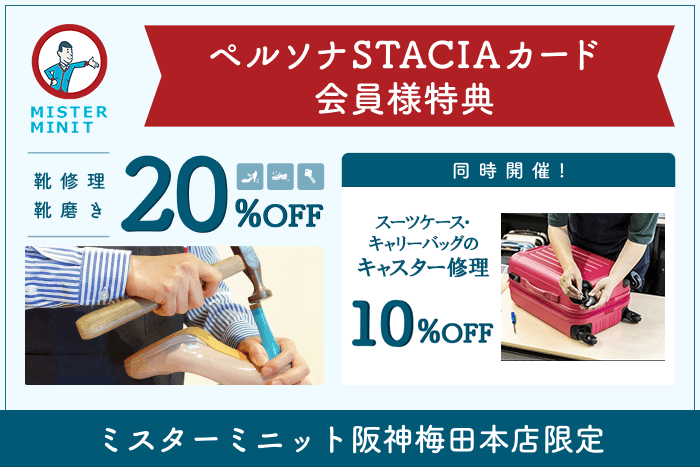 スピードとプロの技術力で人気の靴修理店「ミスターミニット」。今ならペルソナSTACIAカード会員様は「靴修理」「靴磨き」が
