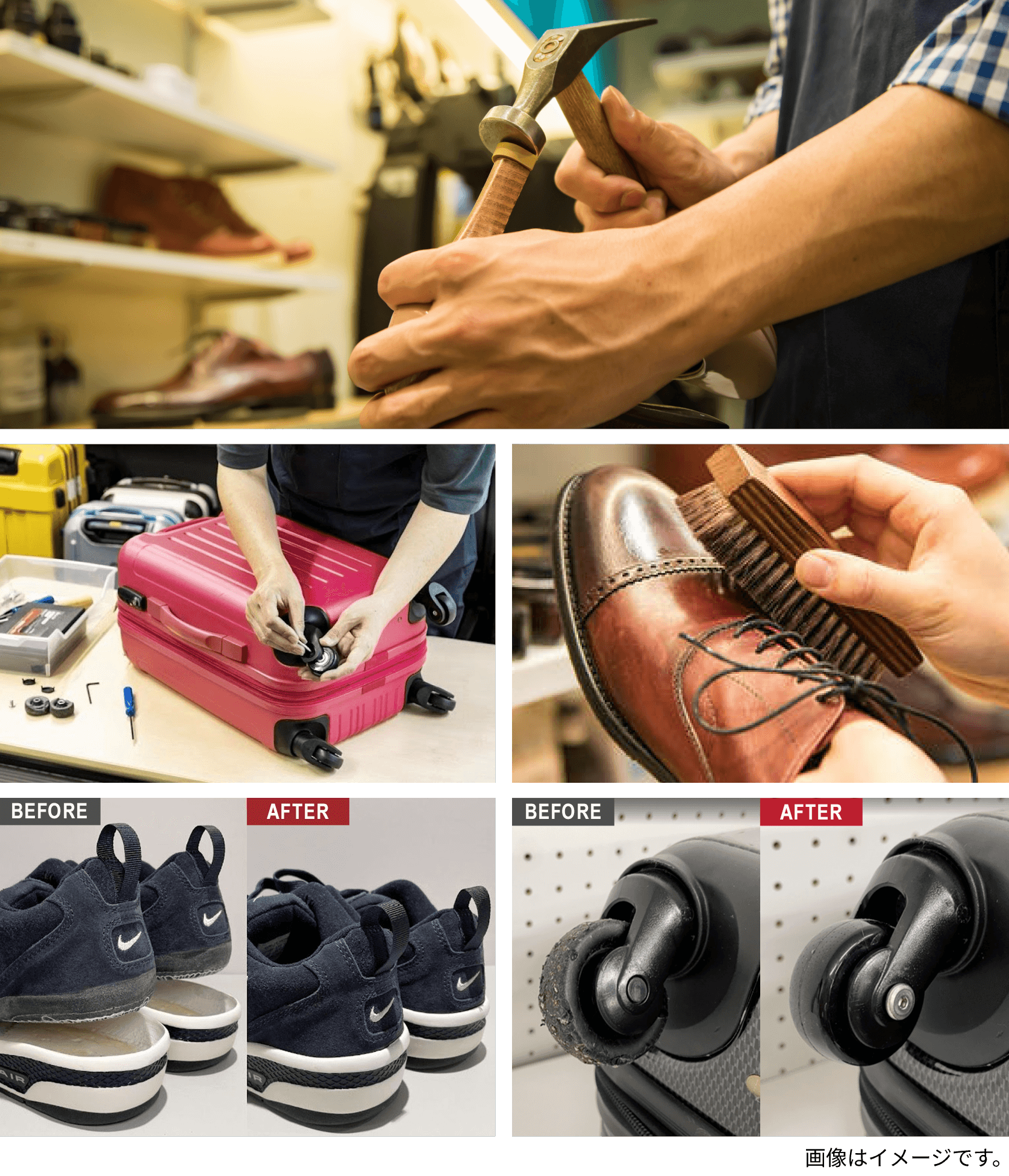 - ※靴修理はメニューにより修理対象が両足、片足、1箇所の場合がございます。